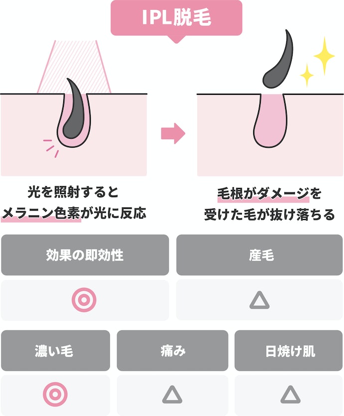 「IPL」は毛根にダメージを与え、濃い毛に効果が期待できる