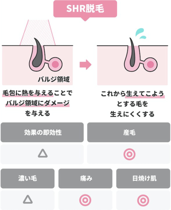 「SHR方式」は「蓄熱式」とも呼ばれ、発毛の指令を出す細胞へダメージを与えて毛が生えるのを遅らせる方法です。メラニン色素に反応しないため、温かさを感じる程度で痛みを感じにくいとされています。