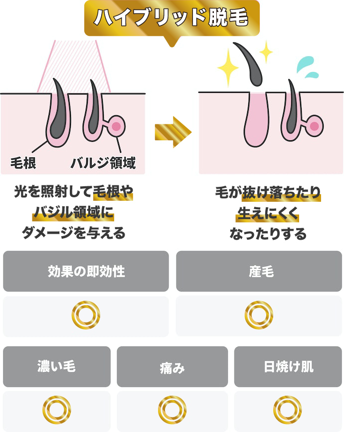 毛根に直接ダメージを与えるパワフルなハイブリッド脱毛には4つのメリットがあります。
