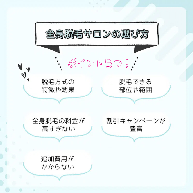 全身脱毛サロンの選び方で注目してほしいポイントを5つ紹介します。