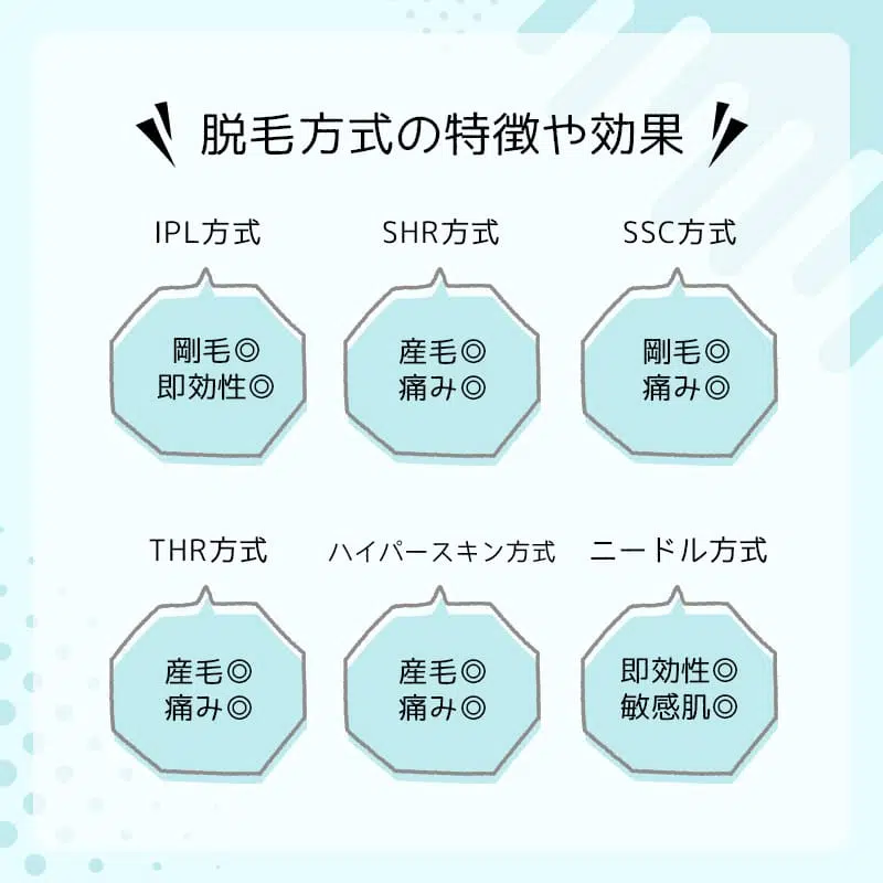 全身脱毛サロンを選ぶ時はまず、自分に合う特徴・効果がある脱毛方式(方法)を選ぶことが大事です。脱毛方法には細かくわけると6種類あり、脱毛効果は使用している脱毛機ごとに異なります。