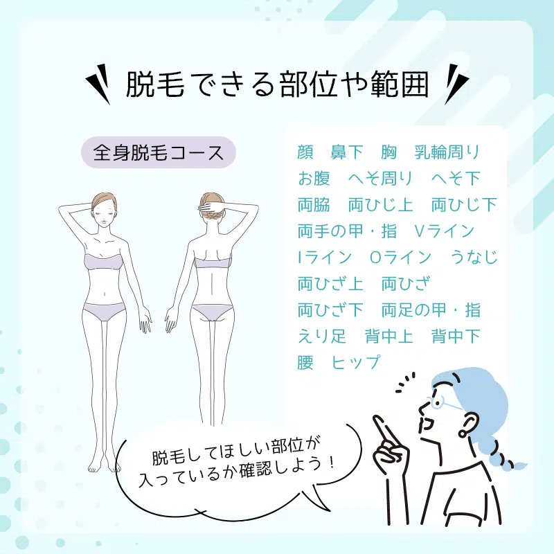 「脱毛してほしい部位が範囲に入っていなかった」と後悔しないように、自分が希望する部位が範囲に含まれているか確認することが大切です。