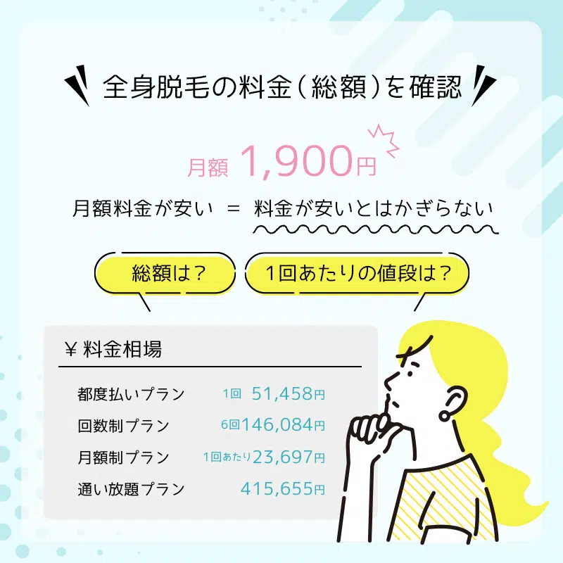 「全身脱毛の料金が高すぎないサロンを選ぶには、月額だけではなく必ず「料金プランの総額」を確認してください。