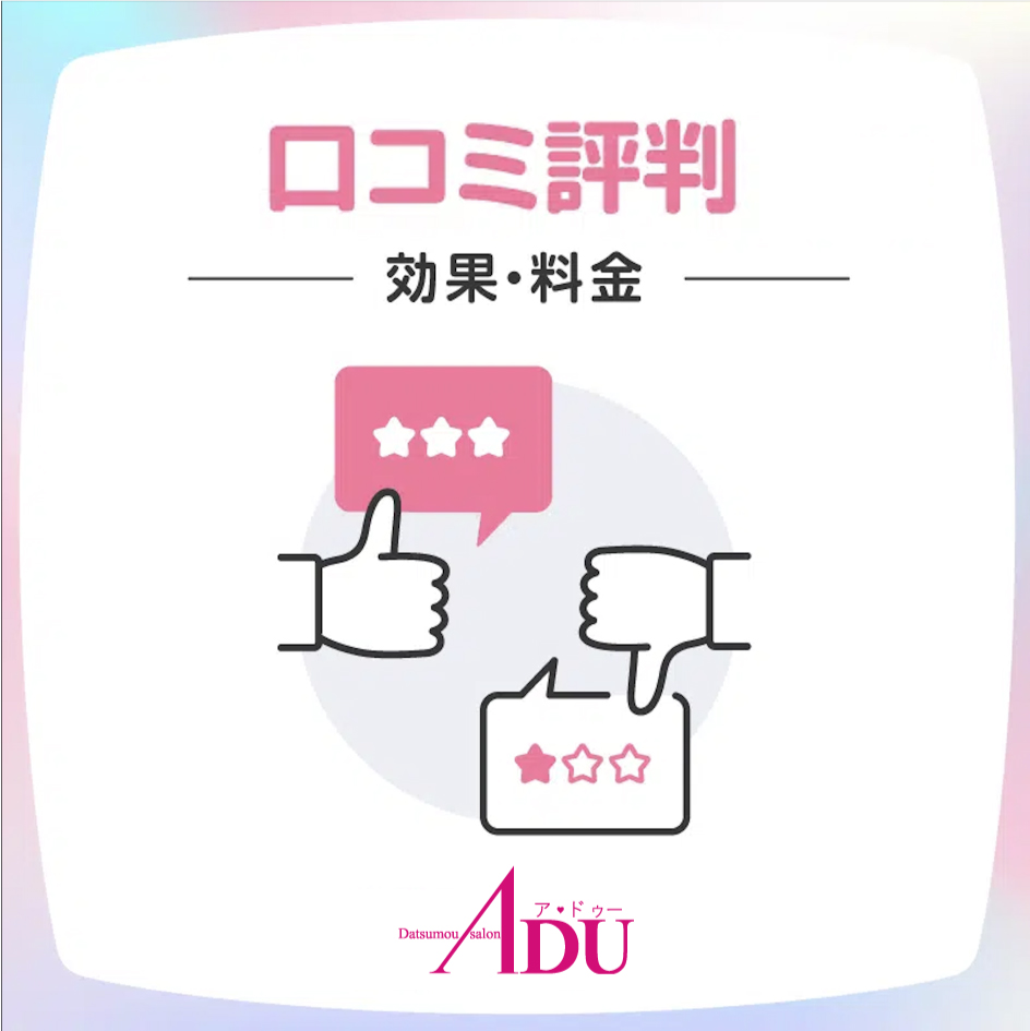 ADUの口コミ・評判を調べたところ、「脱毛効果が高く、料金もリーズナブル」という声が多く見られました。効果・料金・予約の取りやすさなど、ADUに関する口コミを紹介します。
